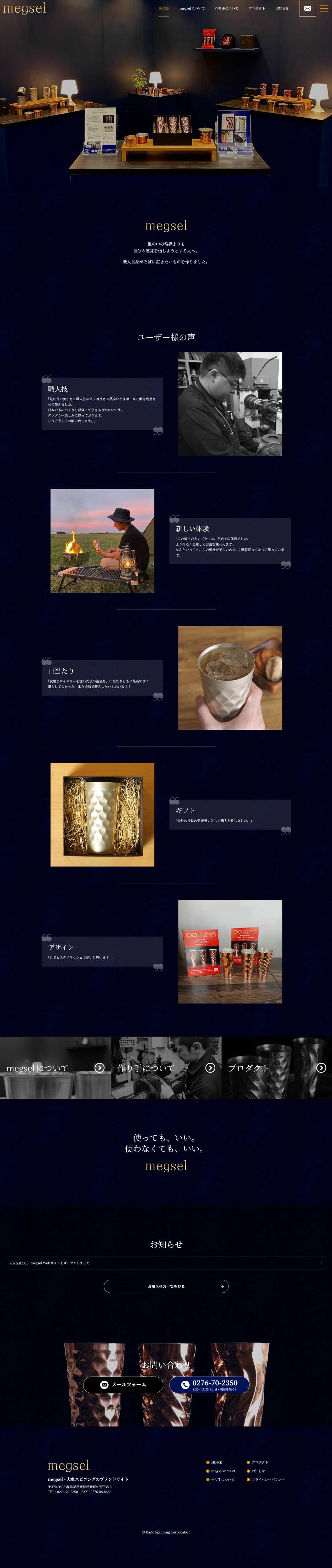 大東スピニング株式会社様が展開するブランド「megsel」のWebサイト制作では、単なる商品紹介にとどまらず、ブランドの思想や作り手の温度感まで丁寧に伝わる構成を意識しました。サイト全体を通して、暮らしの中に静かに馴染む道具という世界観と、職人の感覚から生まれるものづくりの魅力が伝わる設計となっています。